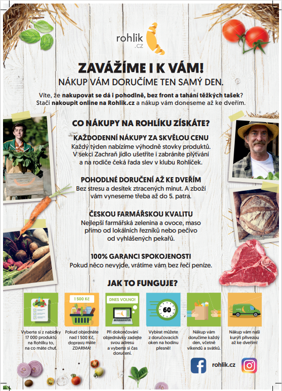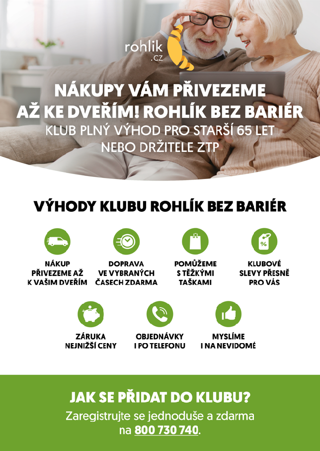 K tomu všemu navíc nabízíme i jistá zvýhodnění pro občany, kteří to podle nás nejvíce potřebují. Máme tak například klub ROHLÍČEK pro rodiny s dětmi do 12 let, nebo klub ROHLÍK BEZ BARIÉR pro seniory, či držitele průkazu ZTP. Tyto kluby jsou samozřejmě zdarma a nabízí spoustu výhod, jako dopravu zdarma v určité časy, slevy na vybrané produkty, a pro seniory, kteří nemají internet, nebo si třeba úplně nerozumí s technikou nabízíme možnost telefonických objednávek..."